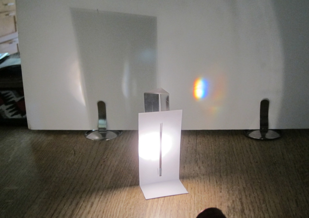 Play with the flashlight and the prism. Try to make a rainbow,