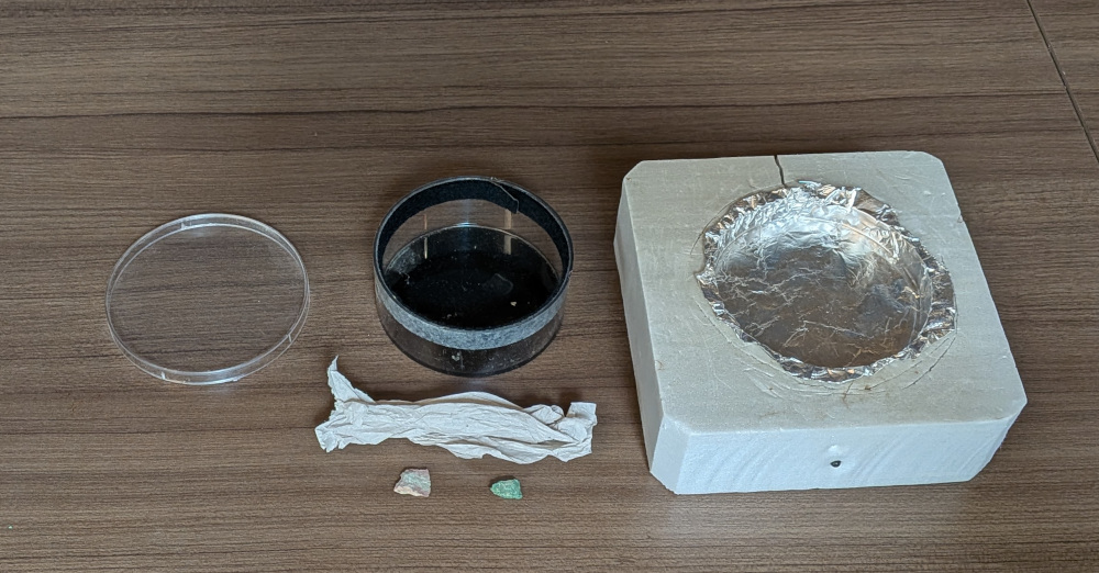 A foam block, with a well for the crushed dry ice. A small can with felt along the wall and a black bottom. Some small rocks that have radiactive minerals in them. We have 12 of these.