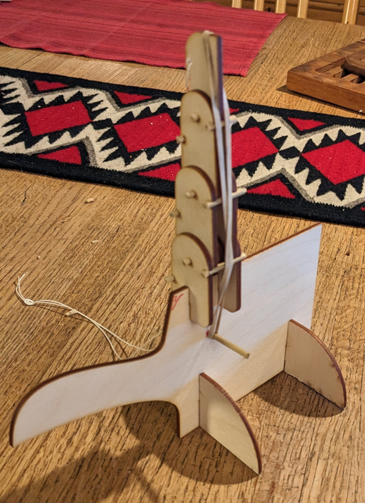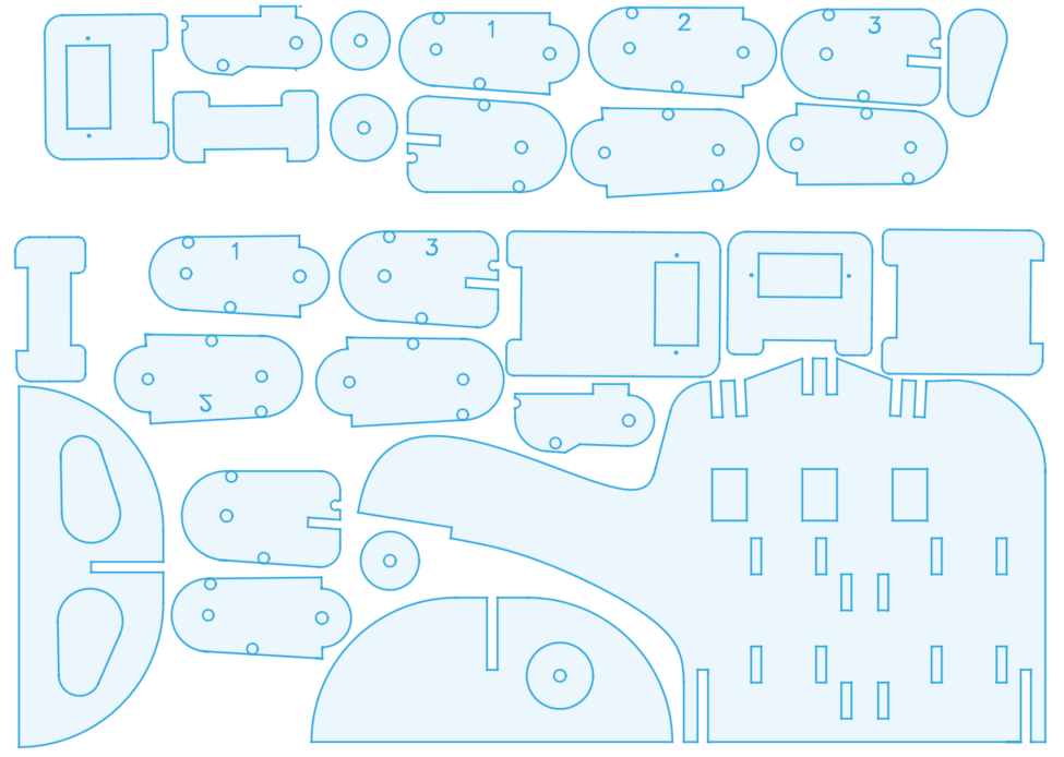 2023: Based on this sketch from Alex, I used Fusion to design the parts, lasercut them out of 1/8" plywood. All the little holes are for 1/8" dowels.