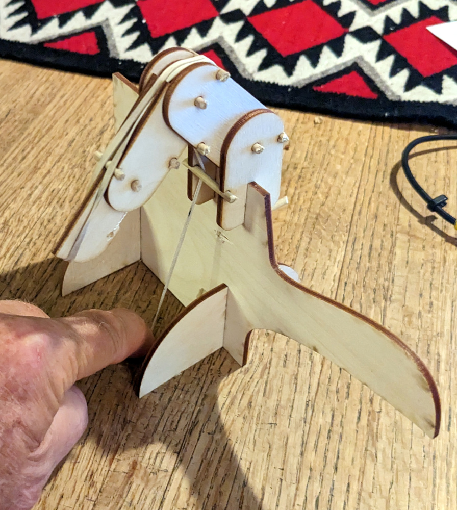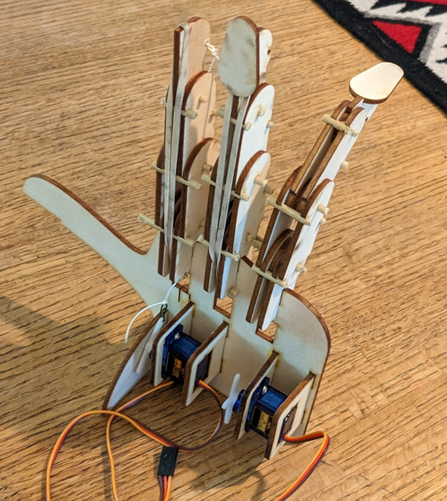 Pulling the string flexes the knuckles. The dowels along the bottom prevent each joint from folding more than 90°.