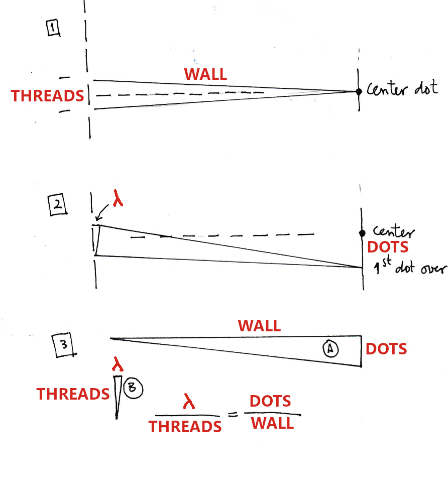 Now look at the diagram. In the top diagram [1] you can see 2 rays coming through adjacent openings between threads. They hit the far wall at the brightest center dot position. (Constructive interference)